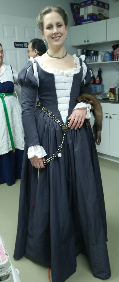 For the sleeves, I drafted a ladies doublet sleeve from Patterns of Fashion to my measurements, mocked it up and fit it. Then I folded down the cap portion of the sleeve and cut out only the bottom in both the grey fabric and a black cotton lining. The portrait shows fairly wide panes in the puffed section, so I cut 4" strips of the grey fabric, which I underlined with a strip of silk organza for bounce before sewing together and turning. Then I folded up the sleeve cap on the pattern, laid the cut bottom portion down on the pattern, and cut the panes to shape at the sleeve cap, and length at the bottom: they're the same length as the pattern under the arm, which holds the puff up some, then about two inches longer on the outside of the arm. The bottoms of the panes are pleated to fit the sleeve, and then the tops are sewn into a facing of white batiste to match my camica, which was cut from the sleeve cap pattern to give them the proper shape. This sleeve is another lesson in why you do more than one mockup (and don't finish making huge chunks of your gown the night before the event) even after altering, once I got it on with the camica (which does add bulk) the sleeve was too tight, which meant it kept trying to creep down my arm, pulling the shoulder strap with it. It was also too short, which I covered for by pulling more of my sleeve ruffle out, which sort of spoiled the look. Ideally I would have done a second mock up of the sleeve with the whole gown (or at least the camica!) on, but I just ran out of time.